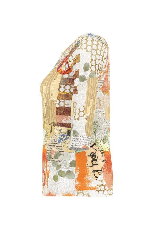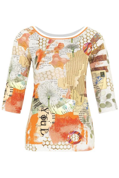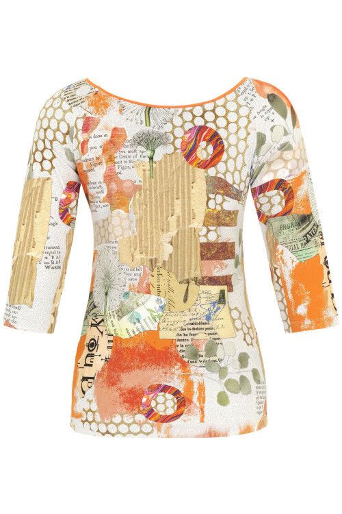 Simply Art by Dolcezza - "Big Changes" by artist Gina Startup, USA. An all over print in orange tonings. Orange and white trimmed boat neckline, 3/4 raglan sleeves. 96% viscose, 4% elastane