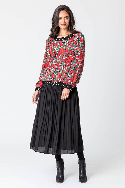 Hip length printed top, keyhole back neck with button. Spot printed elasticated hem and cuffs. 100% polyester crepe