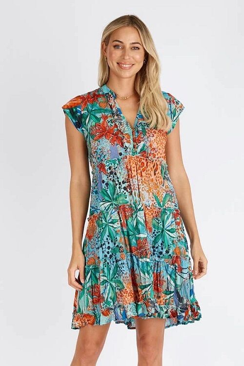A popular style for Lulalife. Notched V neckline, cap sleeves, button front top and tiers which give shape. 100% cotton