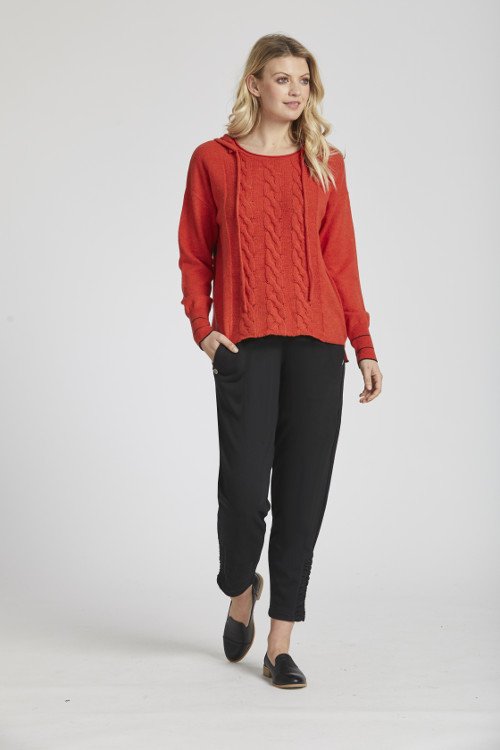 A hooded sweater with a fun twist. Cable detail on the front, black spots on the back. 100% antipill merino