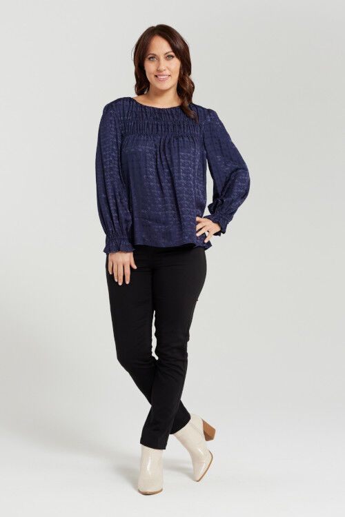 Long sleeve top with gathered and elasticated neckline to bust area. Round neckline and elasticated cuff. Navy fabric has self-coloured houndstooth pattern. 55% rayon, 45% viscose