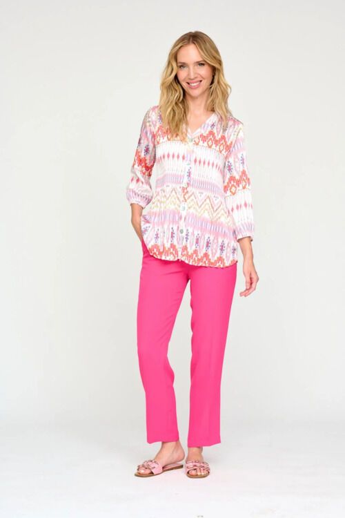 Pleated blouse with geometric print. Fluid fabric. Round neck with V-neckline. Front closure with mother-of-pearl effect buttons. Long sleeves finished with elastic cuffs. Straight hem with volume due to the pleating. Designed and manufactured in Spain. 100% polyester