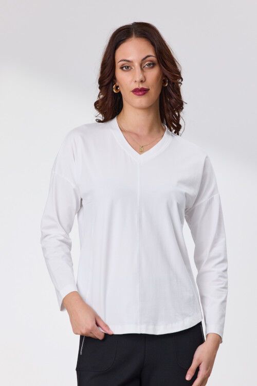 Effortlessly stylish, this long-sleeve tee features a relaxed V-neckline and dropped shoulders for a laid-back look. Side body panels with contrast stitching adds a subtle design twist, enhancing the simple silhouette.  922% cotton, 8% elastane single jersey