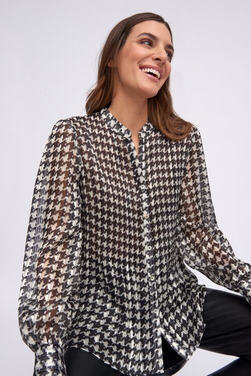 Black and ivory houndstooth shirt with a light metallic thread running through. Finely pleated, button front and long cuffed sleeves. Wear tucked with wide leg pants or a skirt, and loose with slim pants. Designed and manufactured in Spain. 99% polyester, 1% metallic