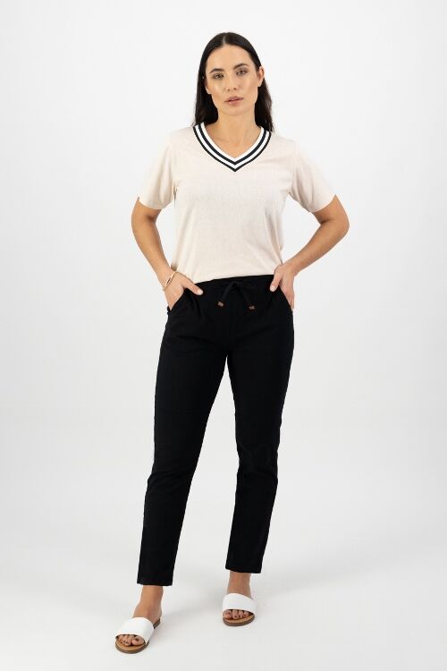 Elastic waist relaxed 7/8 pant with tie front and side pockets. Lightweight fabric. 65% cotton, 30% viscose, 5% elastane