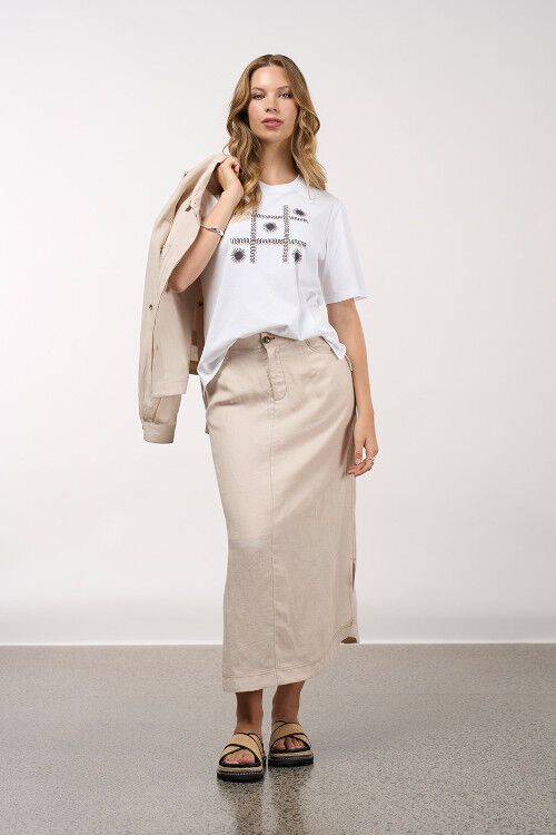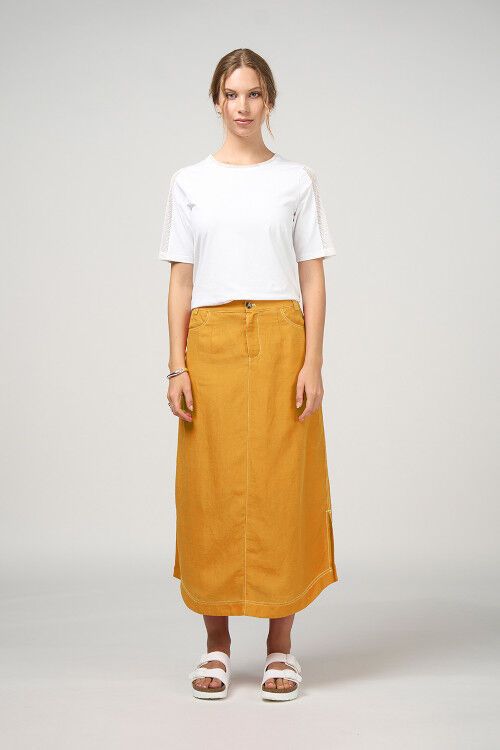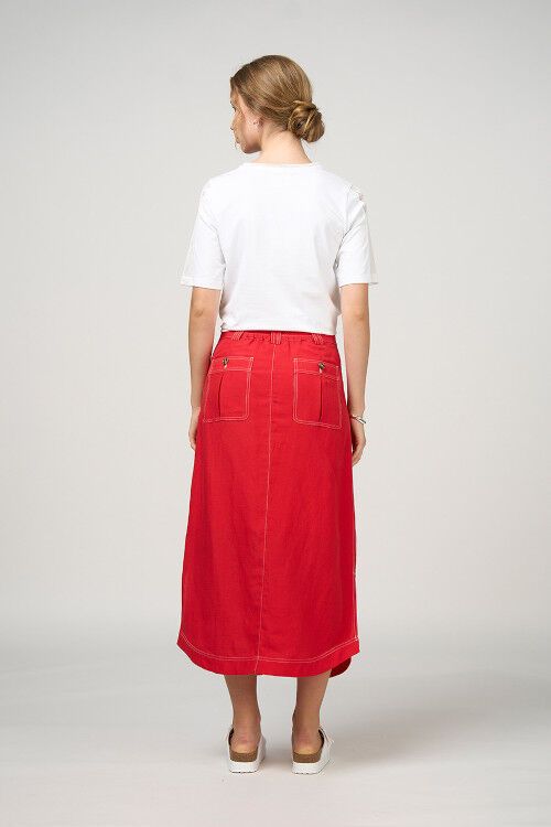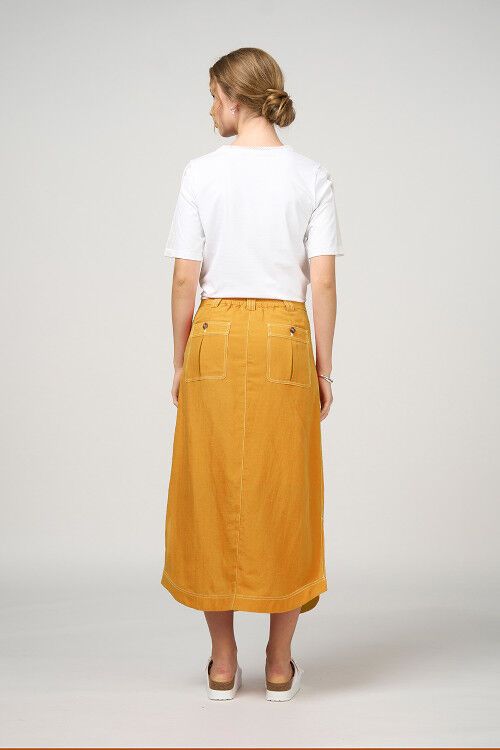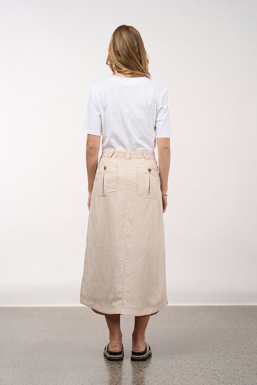 Linen blend skirt with side splits and twin needle detailing. Featuring statement back pockets and a functional fly. An elasticated back waist panel gives the perfect fit. 70% tencel, 30% linen