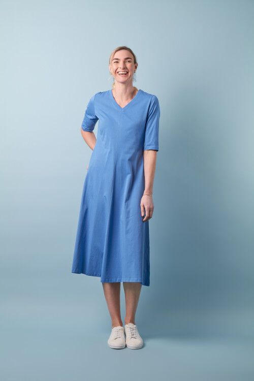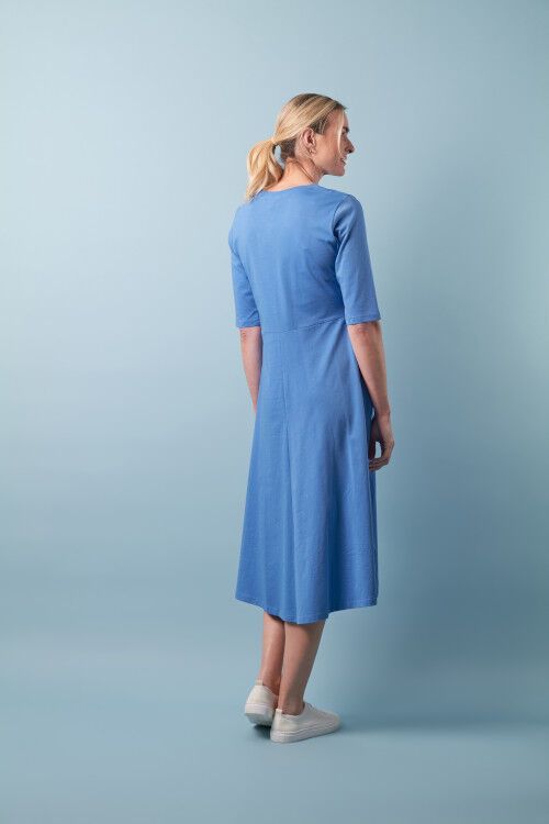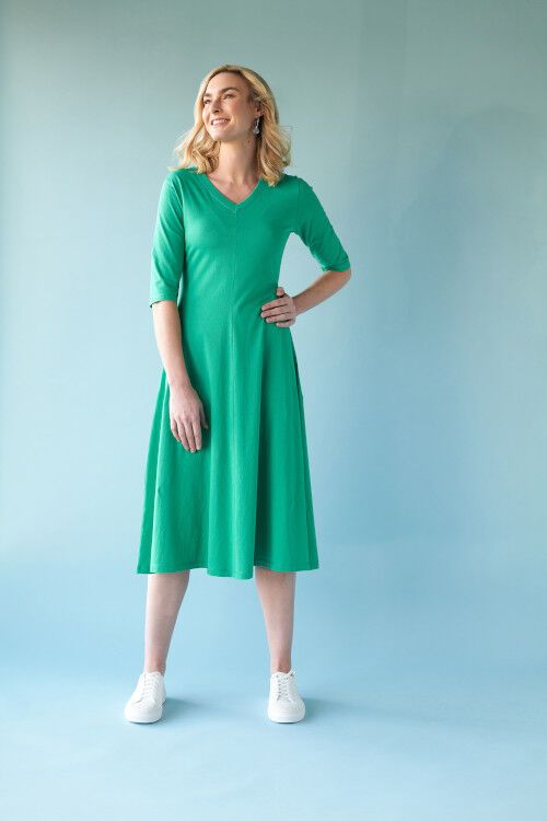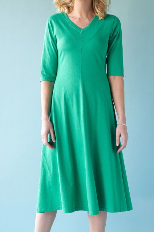 The Aspiring dress is a V neck, longline, swing dress. It features a cap sleeve and centre front and waist seam details. Body length from shoulder to hem is approx. 118.5cm. (size S).