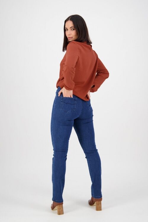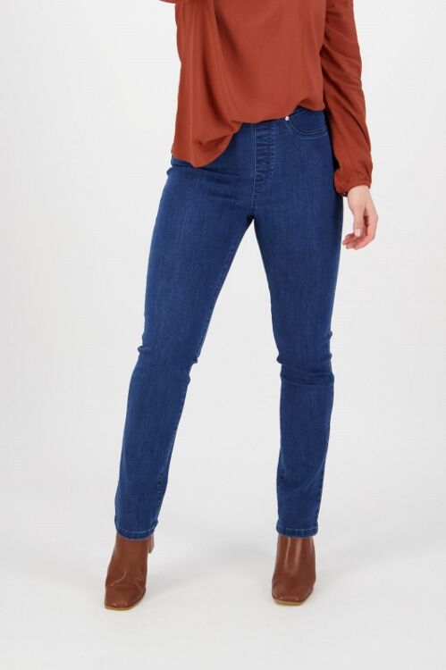 Full-length slim pant in stretch denim with a softly brushed inner for added warmth and comfort. Designed as an effortless pull-on style with an elasticated waistband, this pant creates a smooth, flattering fit and features refined denim-inspired details including a faux fly, faux front pockets, and back patch pockets. 60% cotton, 38% polyester, 2% elastane
