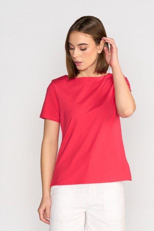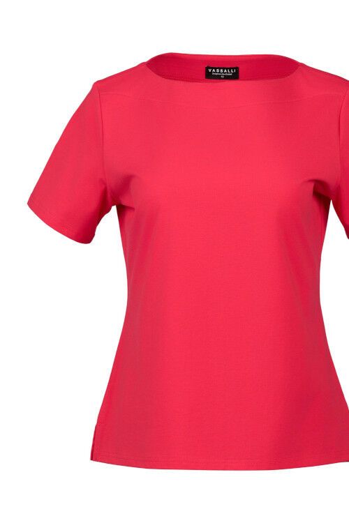 A top for those who want a slighter shorter tee to wear with wide leg pants or skirts. Wide rounded neckline with band, short sleeves and side splits. 95% cotton, 5% elastane