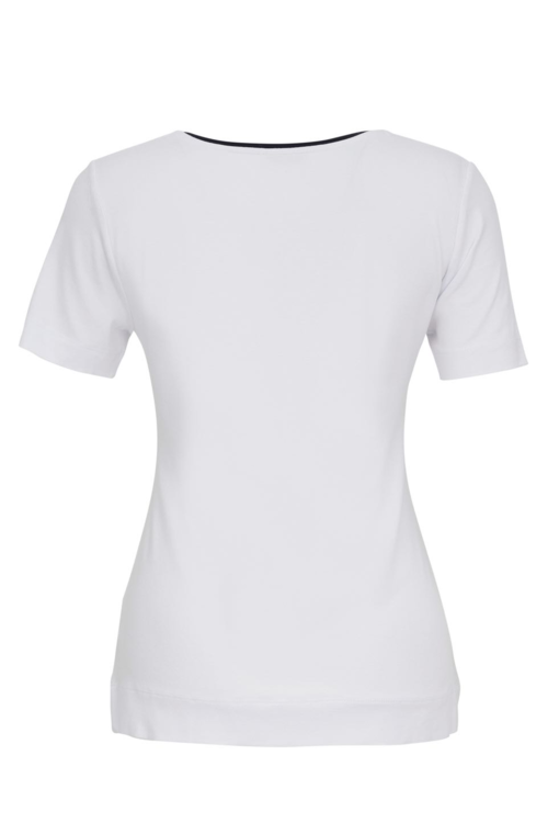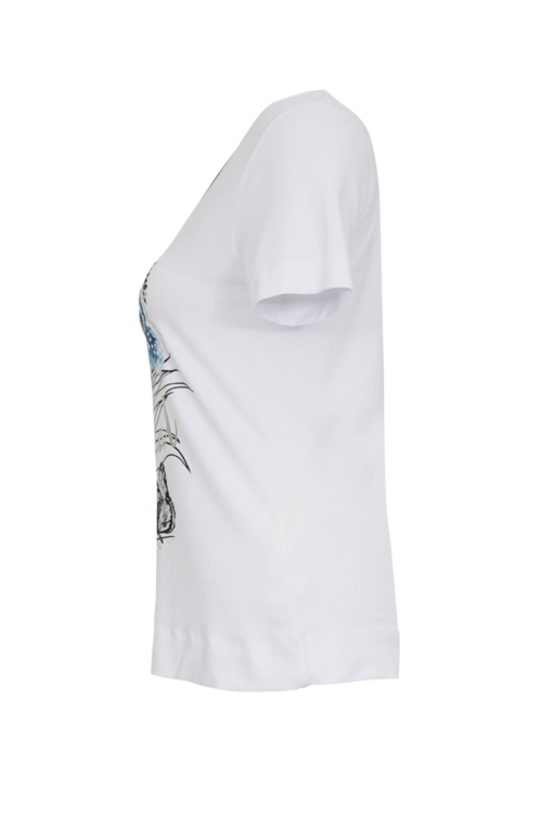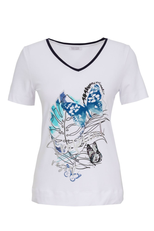 Simply Art by Dolcezza - "Tropical Blue" by artist Bonnie Bruno, USA. A lovely top with V neck, clear rhinestone embellishments and contrasting navy trim, featuring tropical graphic print of butterflies and leaves. Shaped fit and stretchy fabric. 96% viscose, 4% elastane