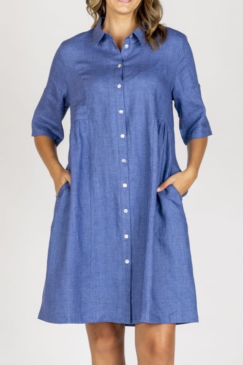 Shirt style linen dress with collar, button front and 3/4 sleeves.