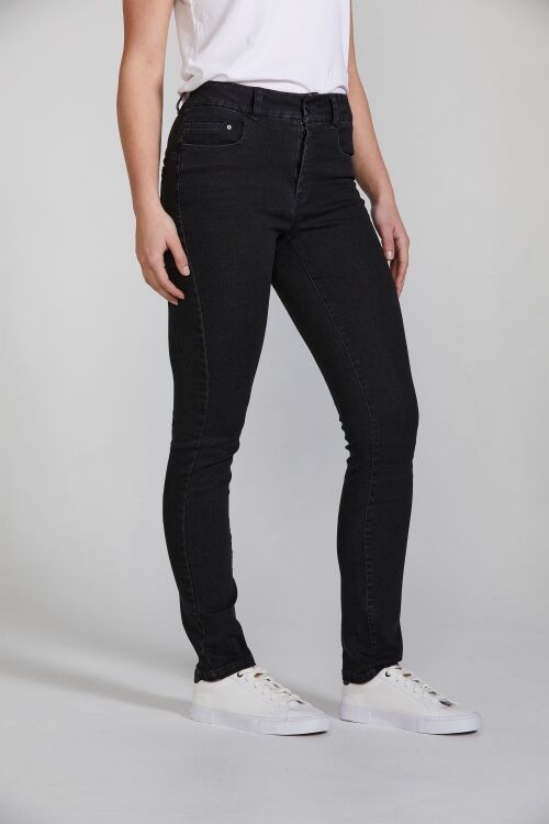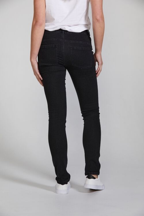 A new essential 5-pocket mid-rise jean in a super stretchy denim. The tonal topstitching, black colour and minimal distressing gives this jean a more formal look - perfect to pair with a blouse for a casual take on eveningwear. 51% cotton, 23% polyester 14% lyocell 10% rayon 2% elastane