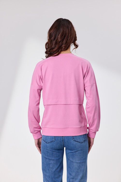 Relaxed yet refined, this soft Cotton Elastane sweatshirt features a flattering V-neckline and dropped shoulders for a laid-back silhouette. Kangaroo pockets add casual charm and functionality, while rib panels at the sides and a pleat detail at the back elevate the design with subtle structure.  95% cotton, 5% elastane loop back terry
