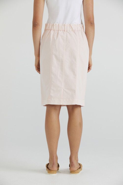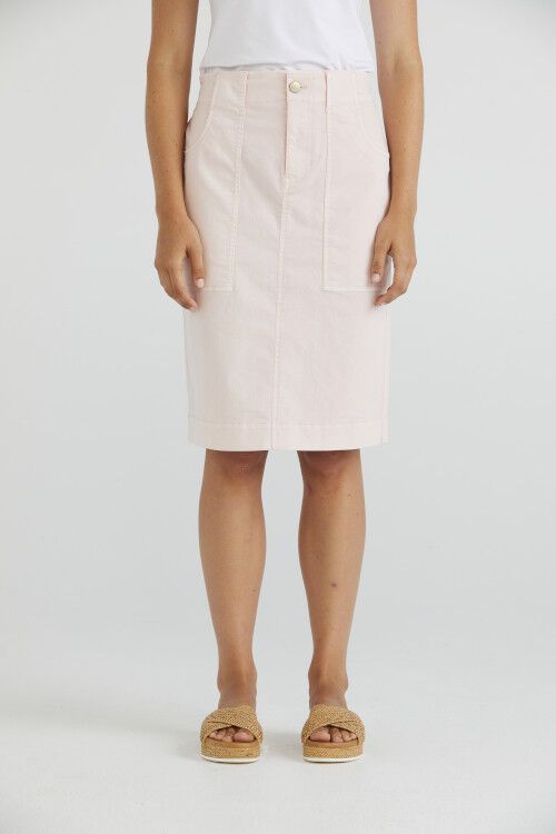 The Cambridge is a fitted knee-length skirt featuring a fly front opening with elasticated back waistband. Soft gold metal hardware and contemporary deep patch pocket and belt loop design complete the look. The garment-dyed finish gives it a cool, edgy, distressed look with a soft and comfortable feel. Whether you dress it up or down, it's the perfect choice for effortless yet stylish dressing.  58% cotton, 39% polyester, 3% elastane