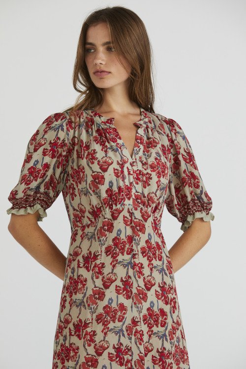 Embrace effortless elegance with the Casia Dress, a midi-length silhouette in the floral Casia print on a viscose rayon blend fabric. The border design at the shirred sleeve cuffs adds a touch of charm, while the elasticated back waist provides a flattering fit and all-day comfort, making it a versatile and stylish choice for any event.  63% viscose, 27% rayon