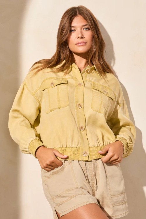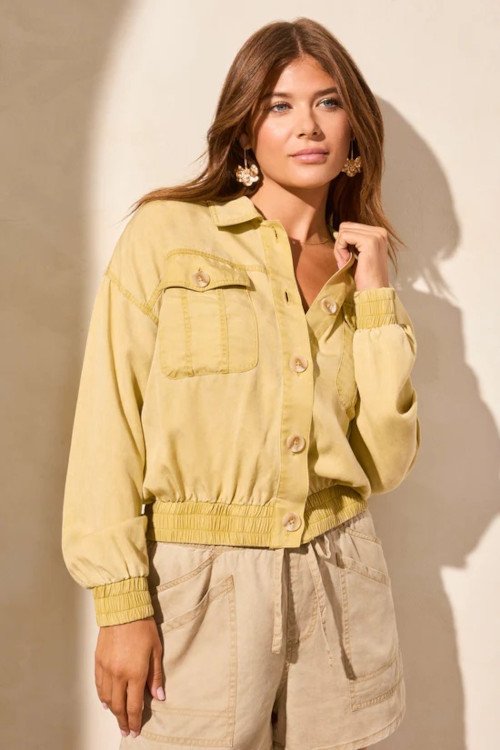 Button up this casual jacket for a layer of lightweight warmth crafted from rugged cavalry twill, featuring a special wash that enhances its relaxed charm. Elastic details at the waistband and cuffs help retain heat, while patch pockets seamlessly blend style with functionality. 100% Lyocell