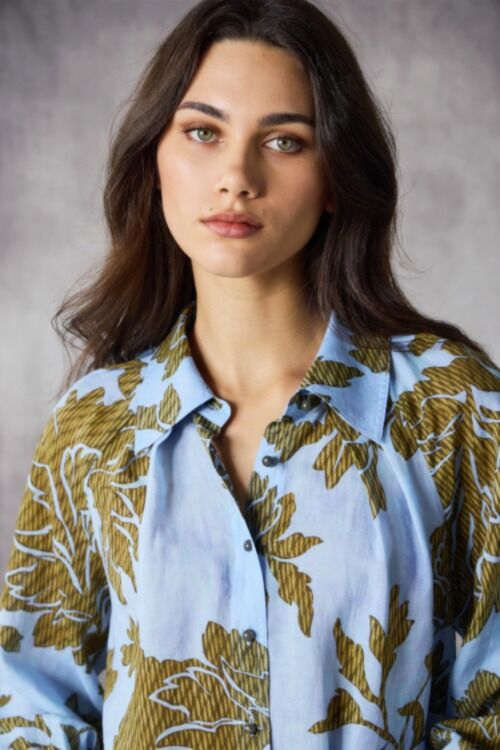 The Cello Shirt, crafted from a Tencel-linen blend, showcases the striking Cello Print. Featuring a collared button-through design with tonal dome glass buttons, it’s finished with soft tucks at the neckline and sleeve head for a flattering fit. A versatile wardrobe staple for sophisticated, modern styling.  50% ramie, 50% tencel