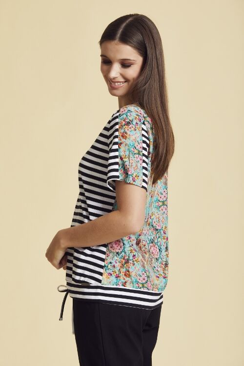 Stripe tie front top with print back and sleeve detail. Print: 100% viscose; Stripe 95% cotton, 5% elastane