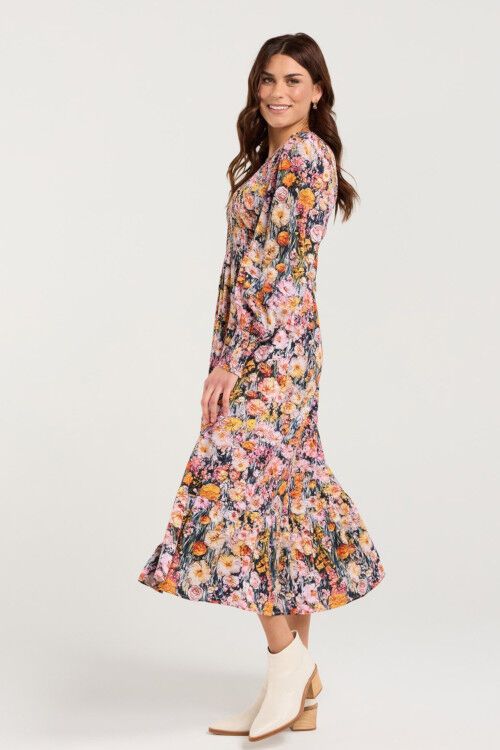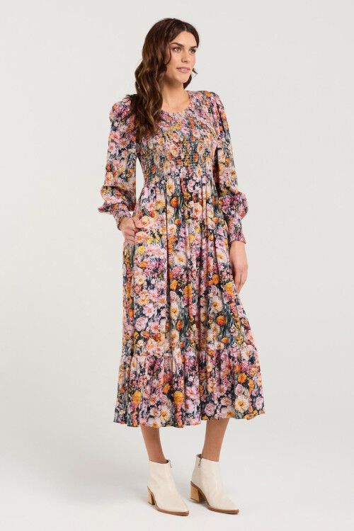 The Charlotte Shirred Dress from Blackstone's is sure to be your new wardrobe staple, effortlessly balancing comfort and style. Crafted from 100% rayon this dress promises a soft flowy feel thats perfect for any day out. Designed in shirred style for a flattering fit it embraces both simplicity and elegance. Featuring all of the colours of the season the Charlotte will be the perfect piece for any occasion. Features: Shirred bodice and shirred cuffs; Single wide bottom ruffle; Midi length hemline. Model is 178cm tall and is wearing a size 8.  100% rayon