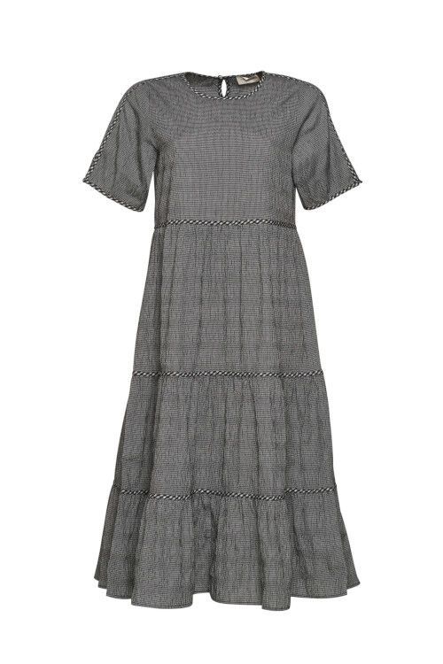 Seersucker gingham tiered midi dress with check flat piping highlighting tier seams, neckline and sleeve split detailing. 50% polyester, 48% cotton, 2% spandex