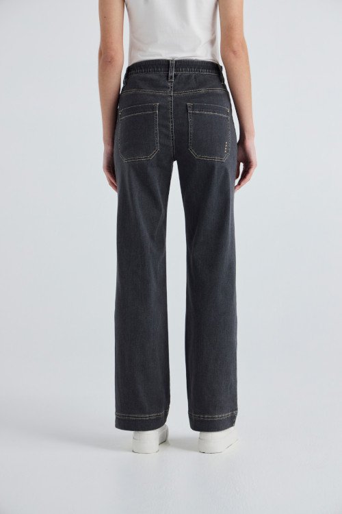The Chrome Jean offers a wide-leg silhouette crafted from the softest stretch denim for unmatched comfort and style. Featuring front patch pockets adorned with cross-stitch embroidery. The deep hems allow for a lovely drape, making these jeans a wardrobe essential.  61% cotton, 26% polyester, 11% rayon, 2% elastane