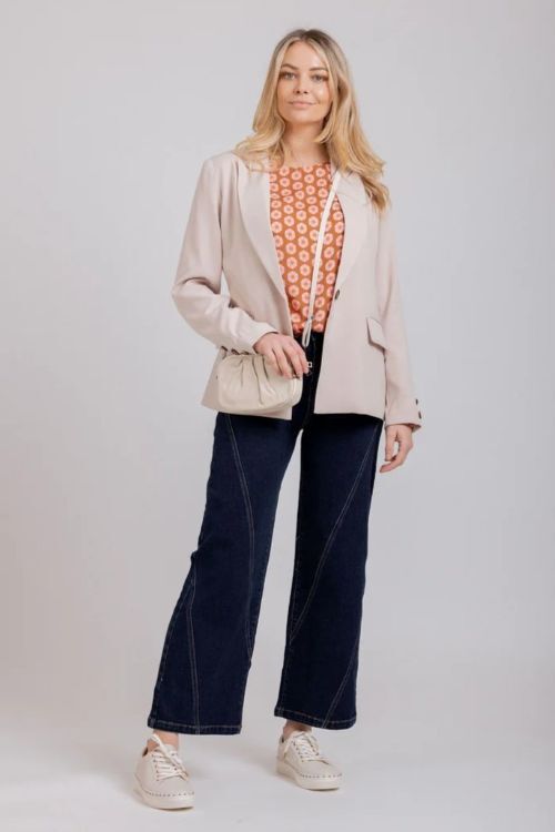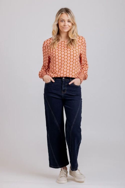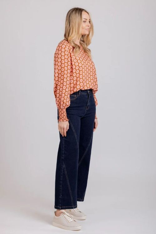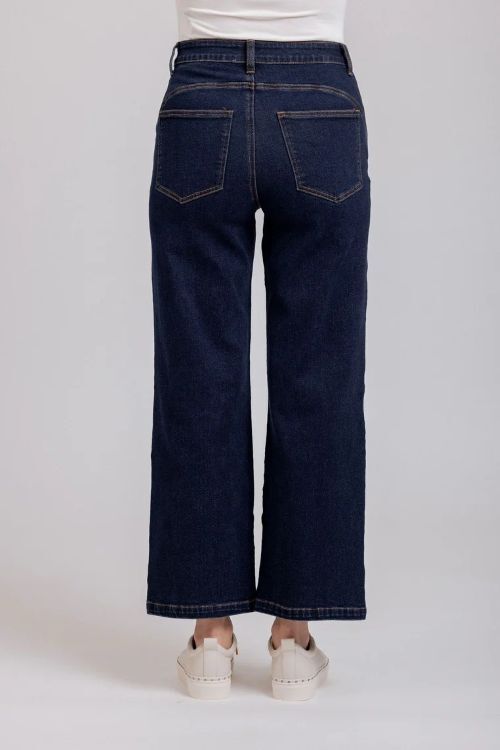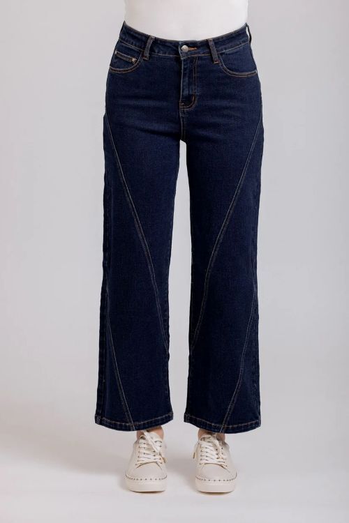A new jean from Mi Moso. Dark stretch denim with angled leg seams featuring contrast stitching. 99% cotton, 1% spandex