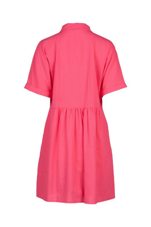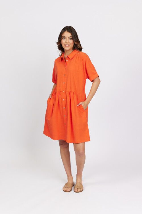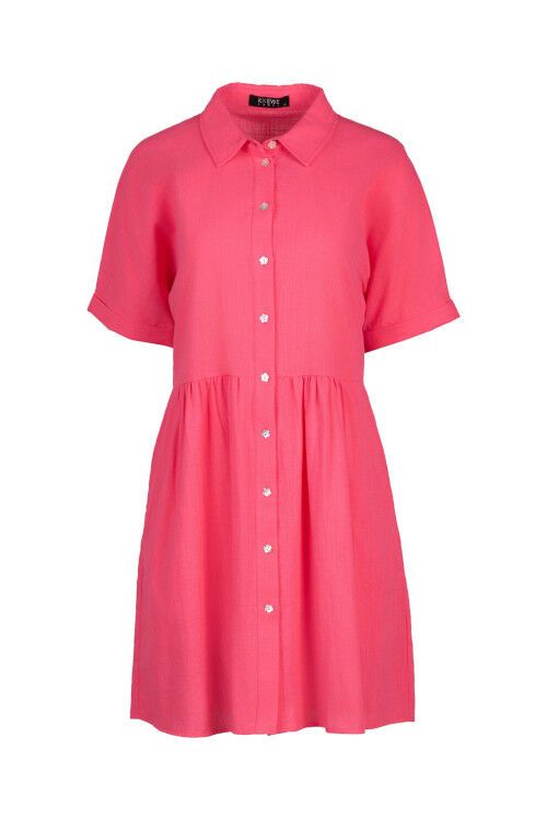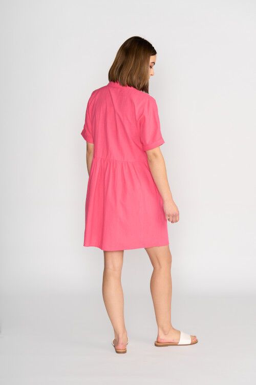 The Cocoon Dress is made from lightweight cotton with a linen look, offering a relaxed fit and easy comfort. It features a button-up front with flower-shaped mother of pearl buttons, a classic shirt collar, and drop shoulders with turned-up cuffs. Subtle gathers at the waist add gentle shaping and practicality for everyday wear.  100% cotton
