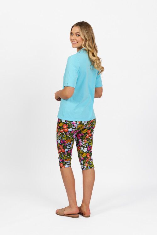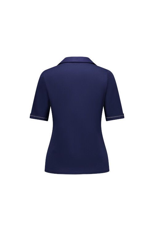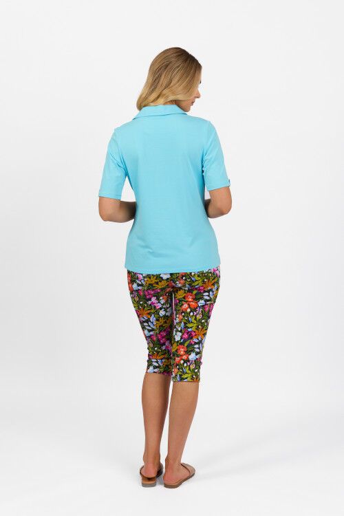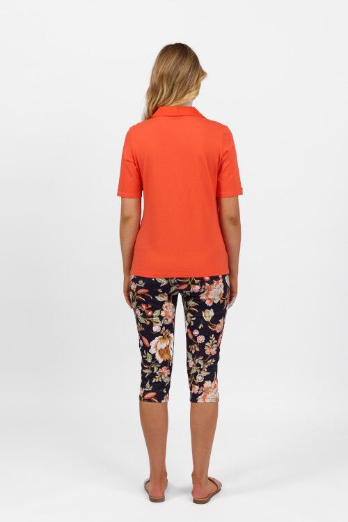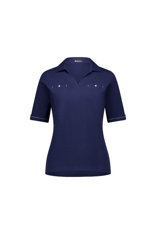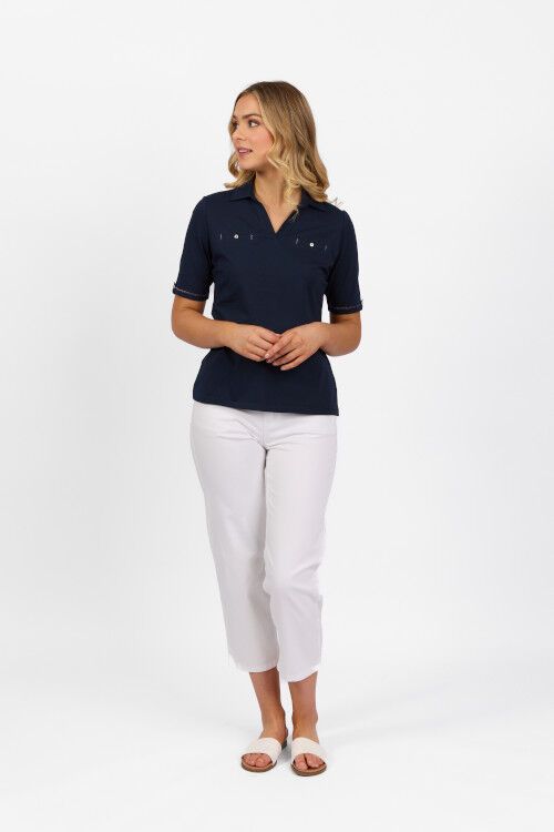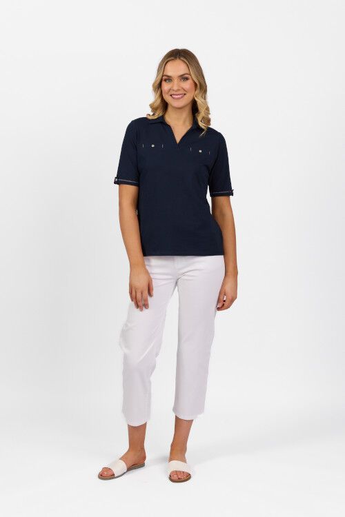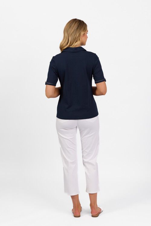 Stretch cotton knit top with collar and good length short sleeves with cuff detail. 95% cotton, 5% elastane