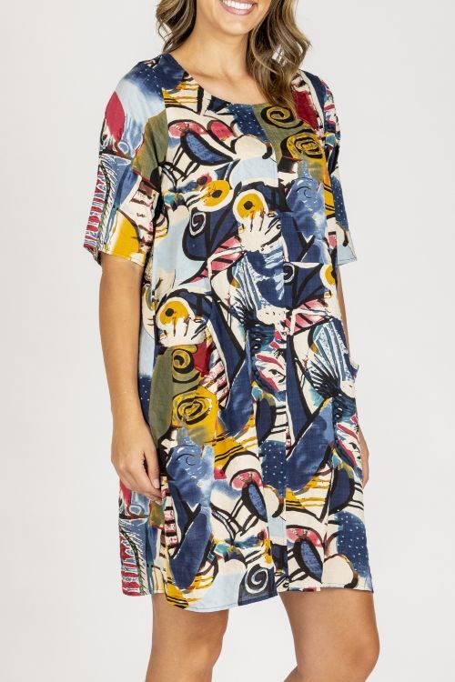 Relaxed fit cool cotton dress with half length sleeves and round neck. 100% cotton