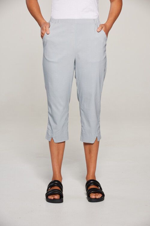 3/4 length pant with notch detail at hem. Pull on elasticated waist. Front pockets. 68% cotton, 27% nylon, 5% elastane