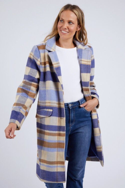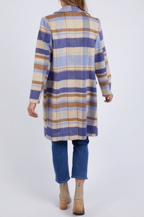 The Cove Check Coat in blue and cream check is a fabulous statement coat for cooler weather. It features a wide lapel, knee-length fall, long sleeves, hip pockets, and contrast lining.  Polyester wool