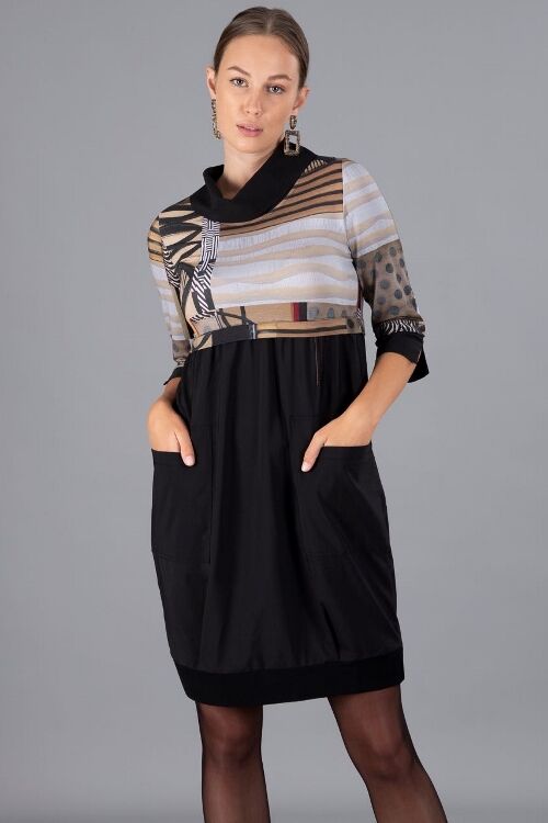 Simply Art by Dolcezza Dress “Poetic Metaphor” – easy comfortable fit dress featuring artistic abstract design of Janet O’Neal (from USA) painting. Half sleeves with slits at cuffs, front pockets, cowl neck, stretchy. Wear it as a dress or as a long tunic. Polyester elastane