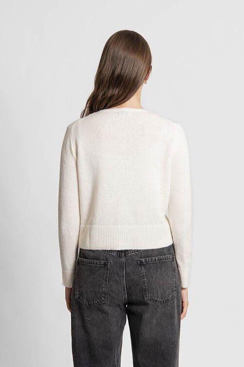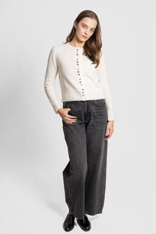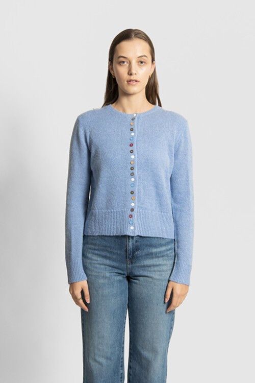 Soft and cosy long sleeved crew cardigan with feature multi colour buttons. 45% acrylic, 30% nylon, 15% wool, 10% alpaca