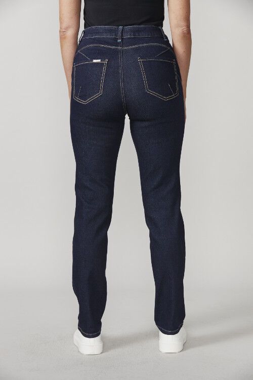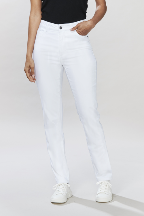 5 pocket denim jean with contrast stitching details.  Indigo - 70% cotton, 25% polyester, 3% viscose, 2% elastane; White - 98% ccotton, 2% elastane