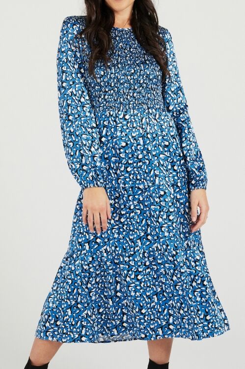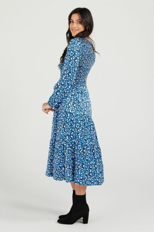 A classic autumn favourite with shirred bodice, a tiered midi skirt and a slight bishop sleeve. Outer: 45% viscose, 55% rayon; Lining: 100% polyester