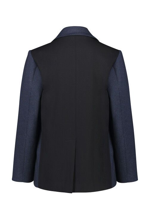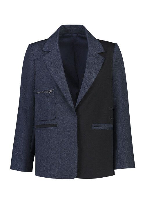 Single breasted boxy-fit blazer with concealed front, back vent and gunmetal pocket zip. Garment is lined.