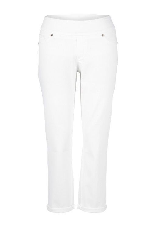 Pullon stretch denim roll cuffcrop pant. Waistband 2 1/2in, inside seam (rolled) 25in, front rise 8 3/4in. 65% cotton, 33% polyester, 2% spandex