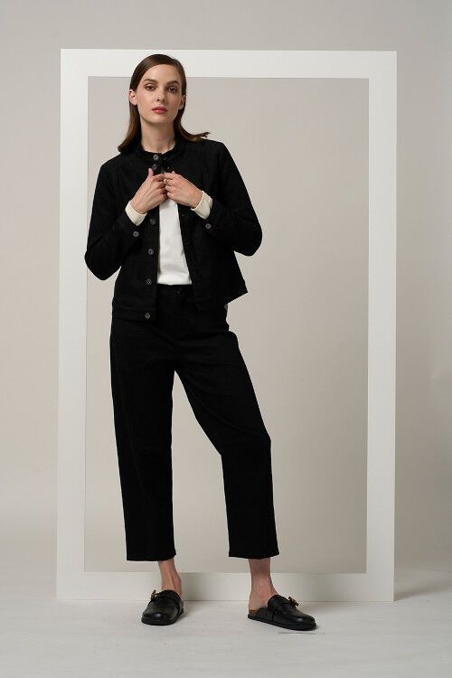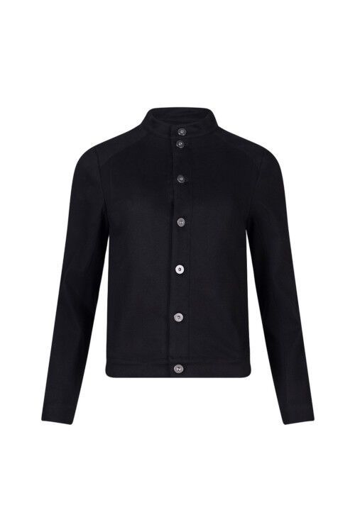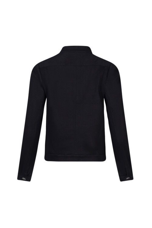 Slim fit cotton jaciket with ponte contrast panels. Low collar stand and small c uffs. Fully lined. 97% cotton, 3% spandex / 68% rayon, 27% nylon, 5% spandex