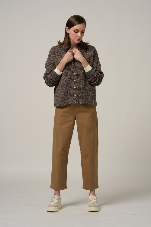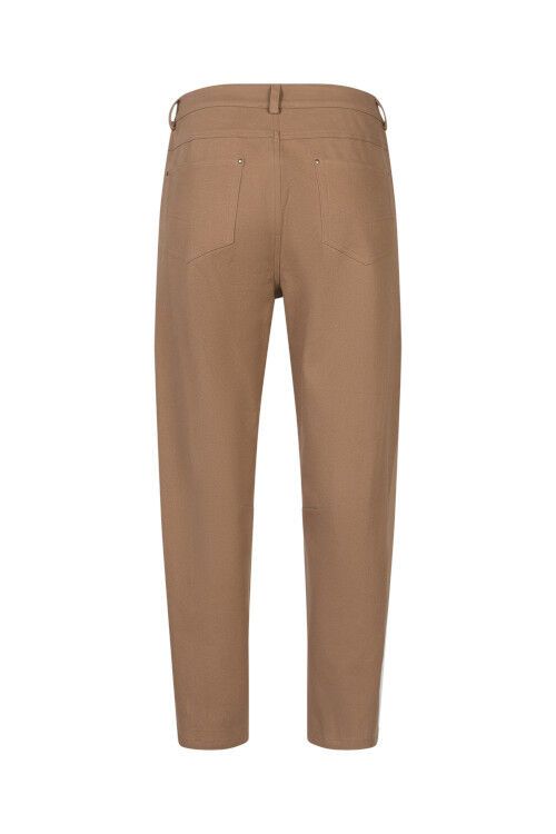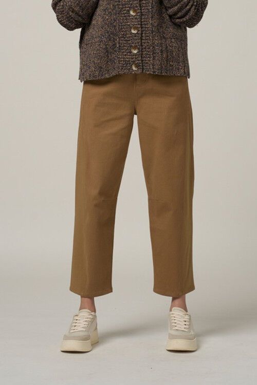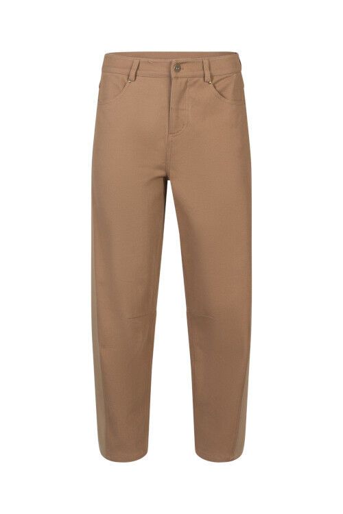 Barrel cotton pant with angled ponte contrast panels and knee darts to create shape. 97% cotton, 3% spandex / 68% rayon, 27% nylon, 5% spandex