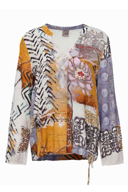 Simply Art by Dolcezza -a print from the painting "Good Enough" by Czech artist Tamara Bakhshinyan. Warm toned all-over print top with V neck, embellishments and a tie at the bottom making it suitable for wearing with skirts or wide legged pants as well as slim pants or jeans. Long sleeves, relaxed fit and lightweight fabric. 100% viscose