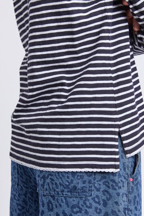 Wear on its own or layer under a jacket or vest. Navy long sleeved tee with small multi coloured spots. Crew neck, long sleeves and rounded hemline. 50% polyester, 38% cotton, 12% rayon