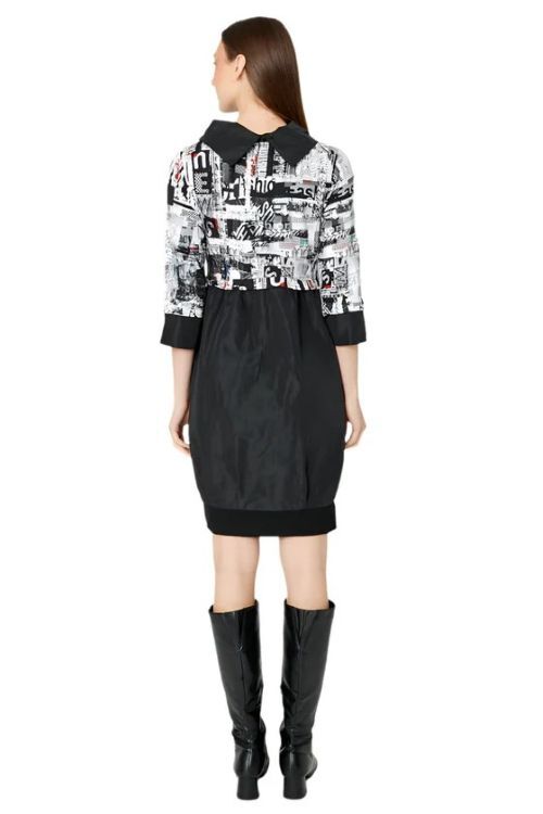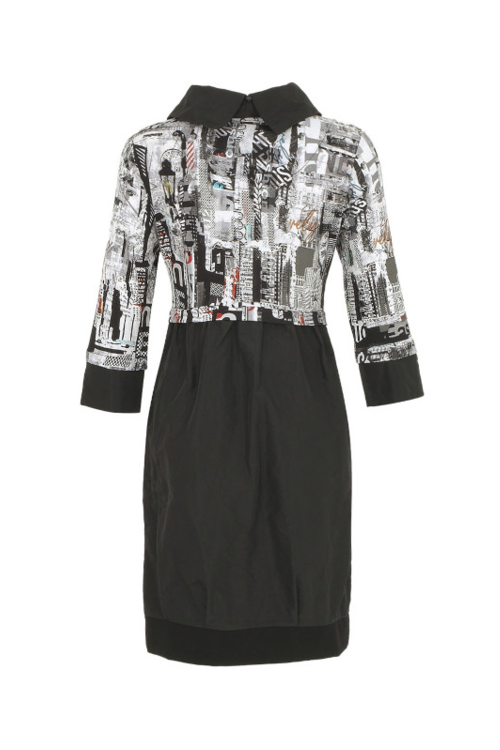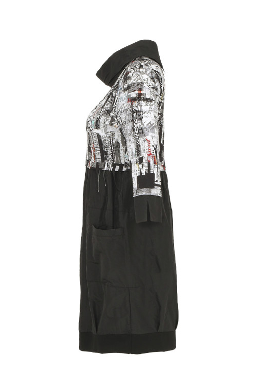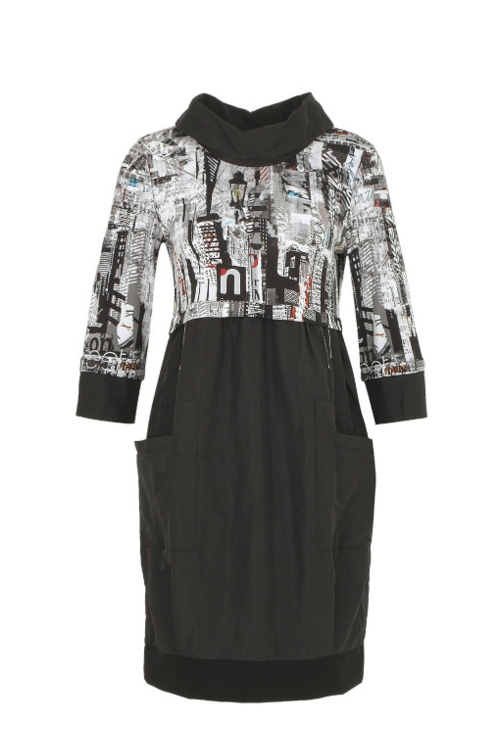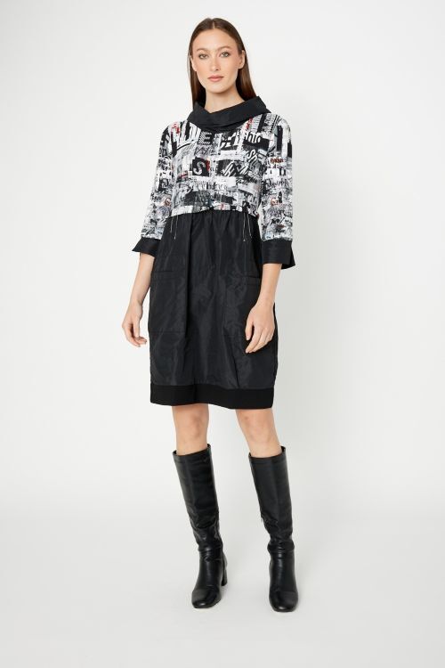 A stylish cowl neck dress featuring a gorgeous Simply Art "City Life" print by artist Basak Erarslan. The print in the top, back and 3/4 sleeves is highlighted by the plain black taffeta skirt, neckline and split cuff detail. There are two convenient patch pockets on the skirt. 95% viscose, 5% elastane