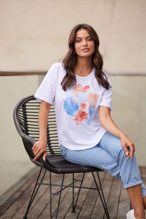 Short sleeve, scooped neck tee with a scooped hem and a beautiful watercolour print.  95% cotton, 5% elastane