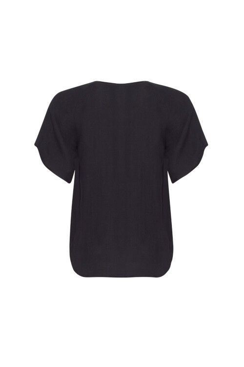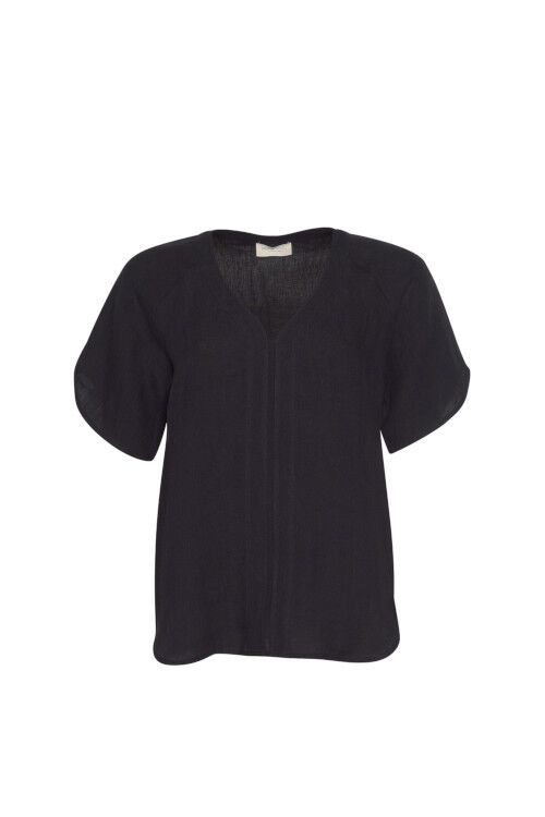 Raglan sleeve, V-neck top with a centre front gusset panel detail, shirt-tail hem front and back and curved sleeve hem. 100% linen