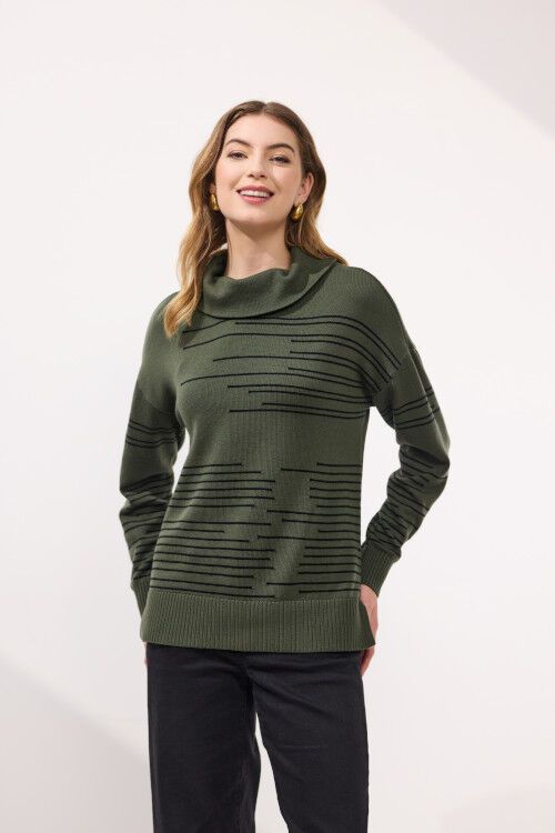 This cozy striped long sleeve jumper is the perfect blend of style and comfort. Featuring a roll neck and ribbed cuffs and hem, this Merino jumper is designed for a relaxed fit while keeping you warm. 100% merino wool