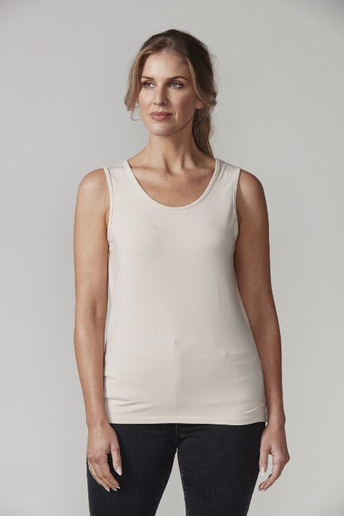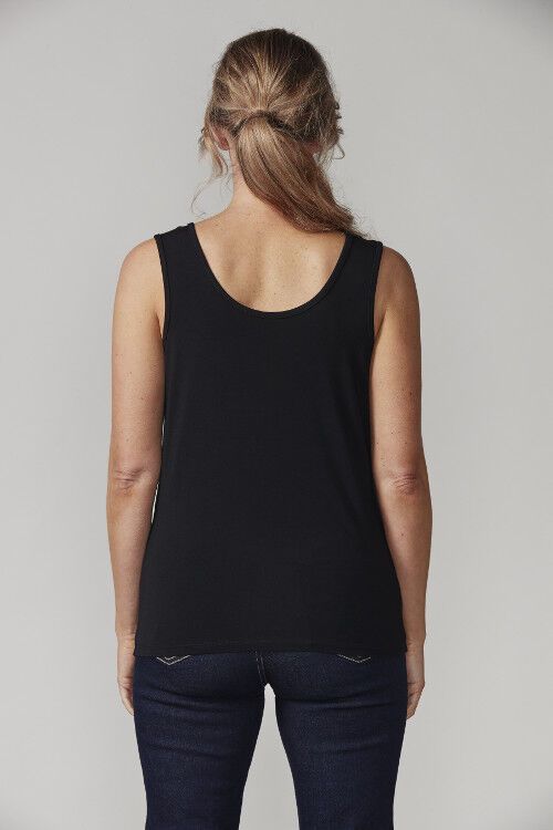 Essential layering tank top, neckline can be worn as a V-neck or scoop neck. 95% viscose, 5% elastane