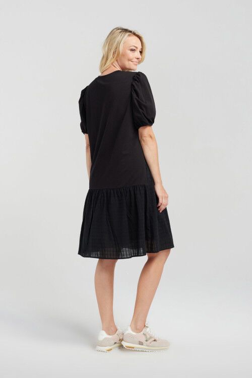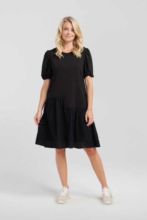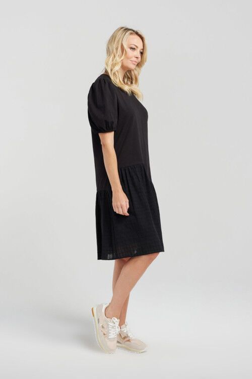 Knee-length t-shirt dress with charming puff sleeves and an asymmetrical bottom panel crafted from contrasting fabric, creating a fashionable and eye-catching look.  95% cotton, 5% spandex; lining 100% rayon