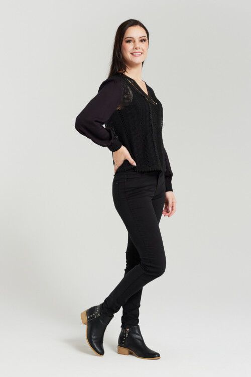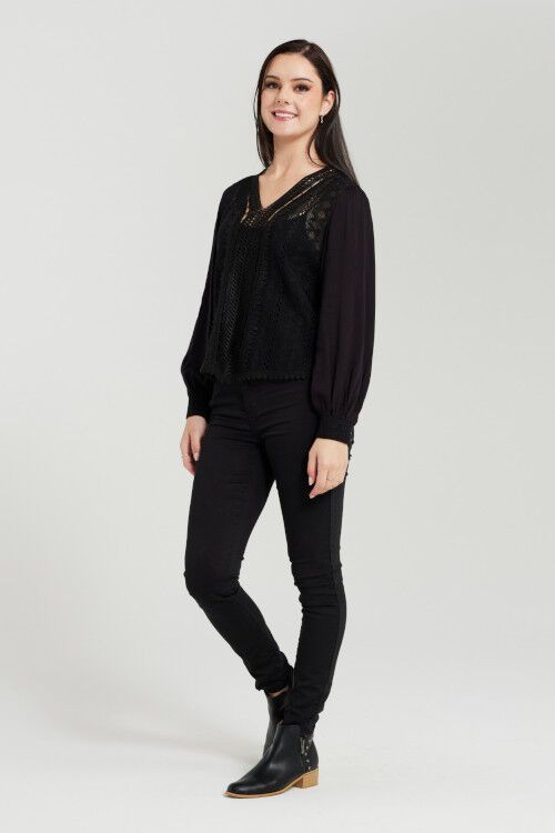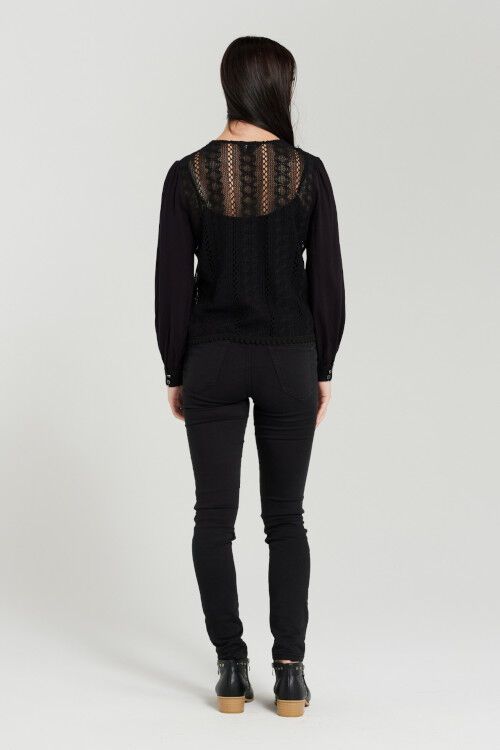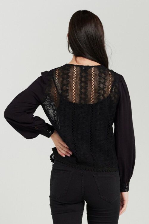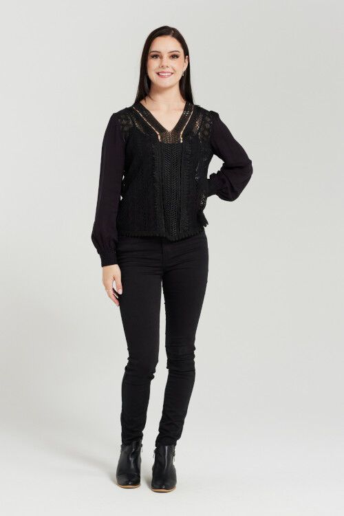 This beautiful black blouse features lace body that adds a romantic touch and makes it perfect for any occasion. It has a relaxed fit, long sleeves, V-neck and delicate lace detail on the cuff. 100% cotton