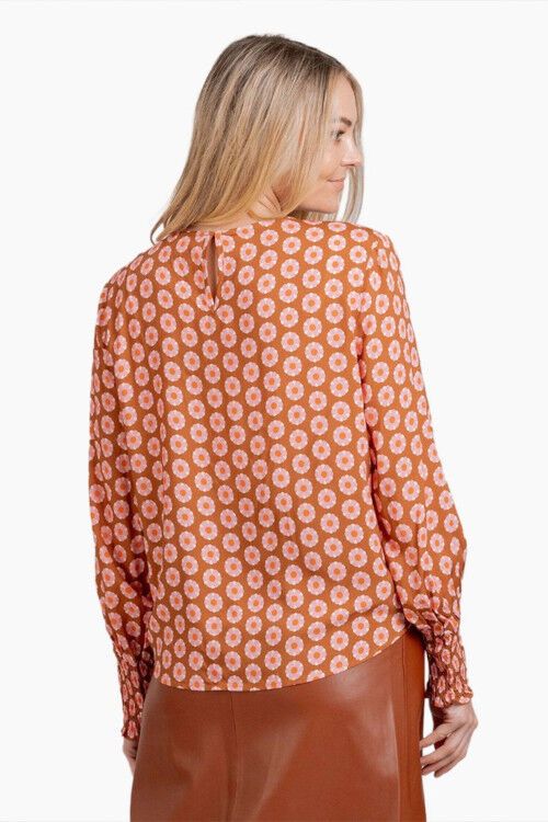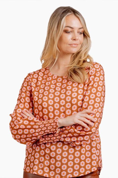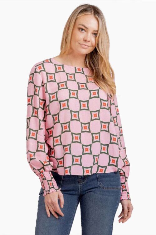 Round neck top with feature shirring at the cuffs and slightly rounded hemline. 100% rayon