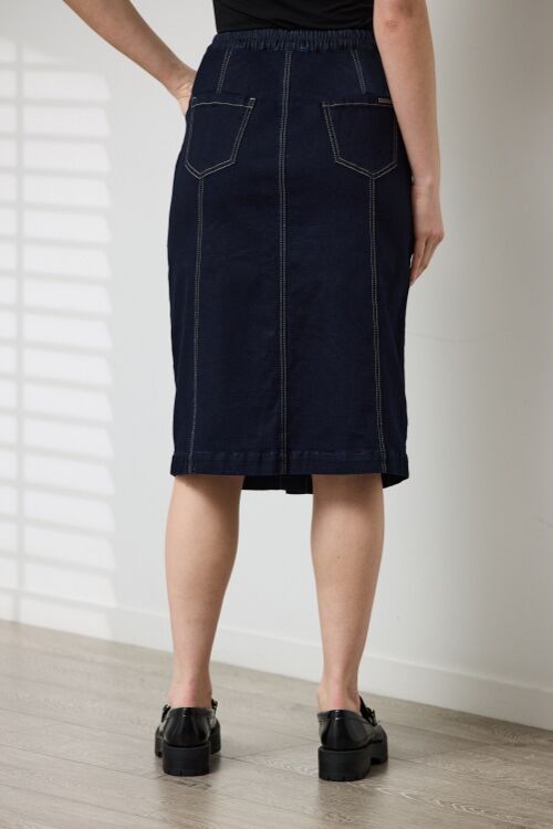 This stylish denim skirt features a flat front and an elasticated back for a comfortable fit. The skirt also includes a mock button front placket and pockets for added convenience. 70% cotton, 25% polyester, 3% viscose, 2% elastane